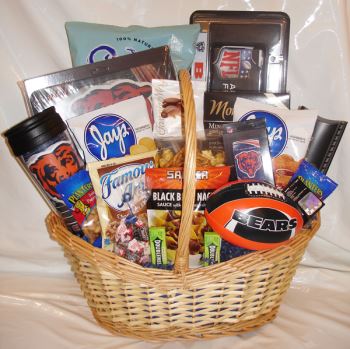 Chicago Bears fans will revel in these tasty ‘ made in Chicago and Illinois’ treats along with a few gourmet goodies complimented by Bears licensed paraphernalia. Any Chicago Bears fan will welcome such a treat, handsomely displayed in our large gift basket and adorned with a blue & orange bow.