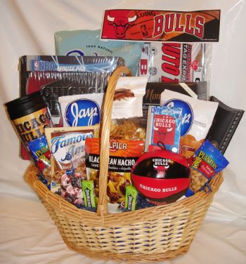 Chicago Bulls fans will revel in these tasty ‘ made in Chicago and Illinois’ treats along with a few gourmet goodies complimented by Bulls licensed paraphernalia. Any Chicago Bulls fan will welcome such a treat, handsomely displayed in our large gift basket and adorned with beautiful a black & red bow.