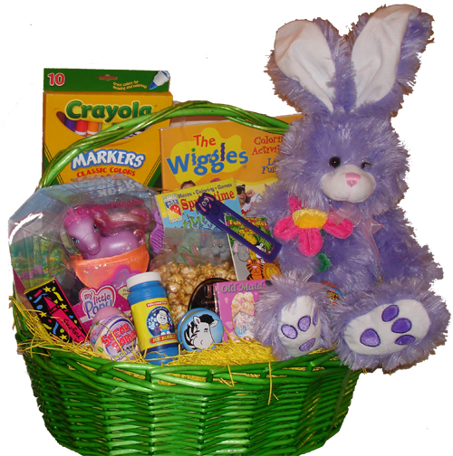 Extra large pastel basket with over-sized bunny, popular kids toy (Pictured is My Little Pony. All toys and games will vary based on gender and availability), Wiggles activity book, Easter coloring and activity book, crayons, markers, animal game, animal book mark, extra large candy eggs, bubbles, yoyo, a paddleball, children’s card game, and caramel popcorn Items not pictured, placed at rear of basket are chocolate candies (gourmet and popular candies), chocolate chip cookies, brown-sugar cookies, Tootsie Rolls, jelly beans, a chocolate bunny, and a pail of cotton candy.  This gourmet Easter basket has what children want, toys of substance, and great candies and cookies, unlike the dime-store basket with more fluff than stuff!  We created this gift basket so that my six-year old twins get more than just a toy they’ll immediately break.