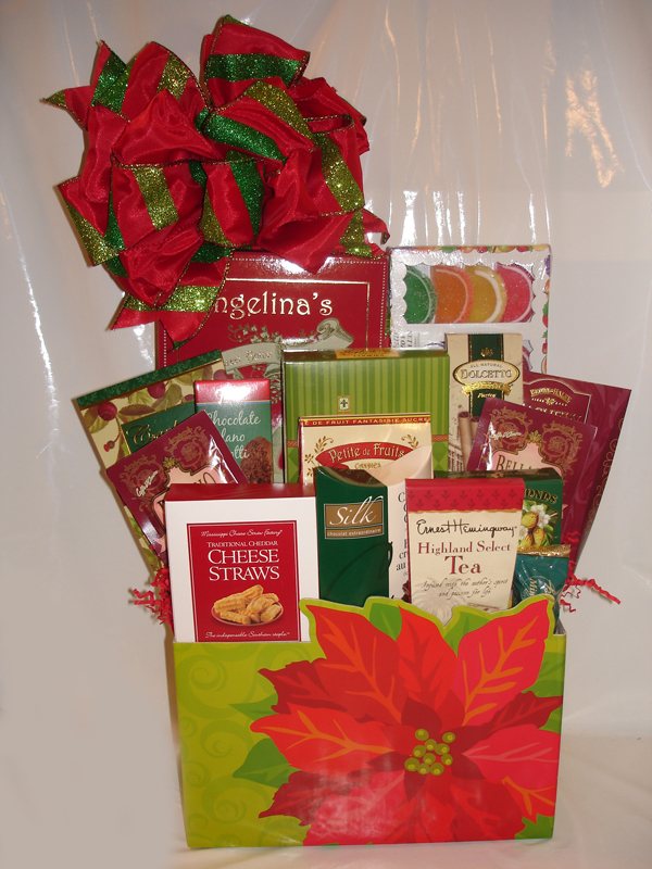 Our designer poinsettia gift box is stuffed full of holiday gourmet treats and adorned with a festive bow.