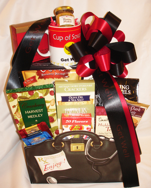 Our novelty doctor’s box is filled with everything the doctor ordered and includes Cup of Soup Get Well Mug, Chicken Noodle Soup, Dried Fruit Medley, Dipping Pretzels, Water Crackers, Olive Oil & Sea Salt Crackers, Mustard, Coffee Cookie, Chocolate Chip Pecan Cookies, Jelly Belly Candies, Tea, Fine Cheese, and Ghirardelli Chocolates.