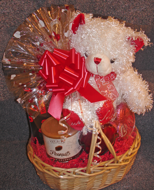 This sweetheart gift is full of passionate flavor. We’ve included chocolate-covered peanuts, chocolate drizzled popcorn with cashews, cookies, truffles, a red-heart candle holder, chocolate lips candies, interlocking heart his & hers silver-plated flutes, chocolate heart candies, and a large “Kiss Me” teddy bear (has Kiss on one foot-paw & Me on the other).