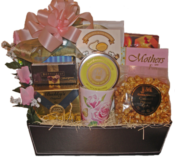 We’ve surrounded the beautiful book, “Mothers are Forever” with a host of treats Mom will love. Our faux leather tray is filled with seasoned pretzels, white chocolate amaretto cookies, English tea, key-lime iced tea, white chocolate macadamia nut cookies, Cajun crunch mix, double-dipped milk and white chocolate pretzels, cheese straws, assorted chocolates, liqueur cake, cheese, crackers, and a mug adorned with pink roses. Makes a wonderful Mother’s Day, birthday, or any occasion gift for a special Mom.