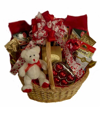 This sweet gourmet treat includes an adorable white and red teddy bear, a heart-shaped box of chocolates, chocolate-covered lips, spicy tortilla chips, a variety of delectable cookies, caramel corn, mocha, and a variety of chocolate wafers adorned with a red and white heart bow. The large is pictured at $65.00